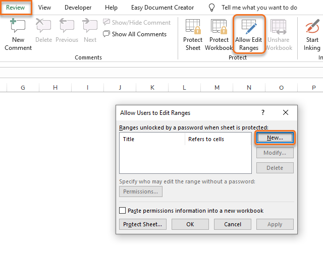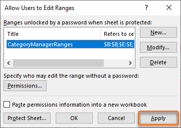- Allow Edit Ranges: Allows users to make changes to certain ranges on sheet level when Protect Sheet is turned on.