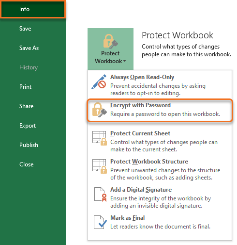 File encryption can be used to password protect the document. You should still always be very careful when distributing workbooks containing sensitive personal or confidential information.