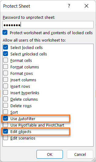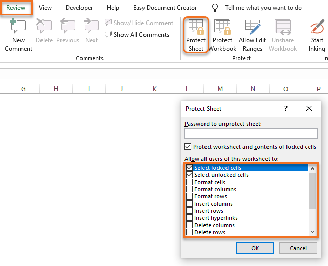 - Protect Sheet: Prevents users from performing certain actions on sheet level.
