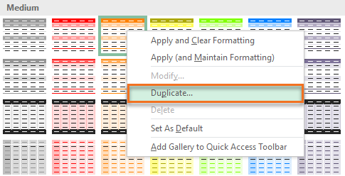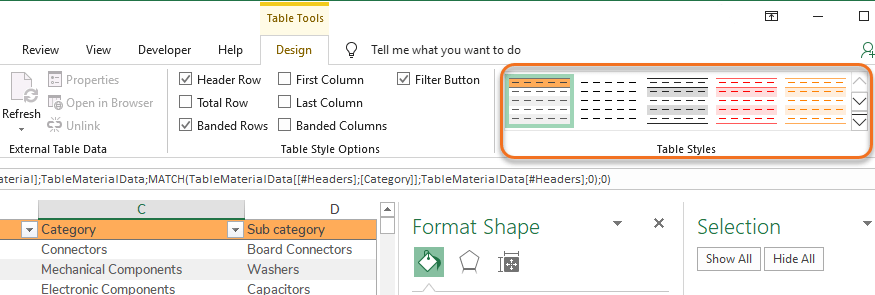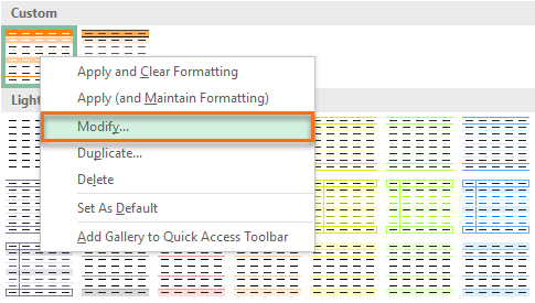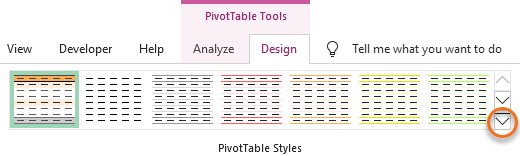 Styles for Tables, Pivot Tables and Slicers are modified in the same way. Their respective options are available when they are selected and the tools menu appears (e.g. Table Tools).