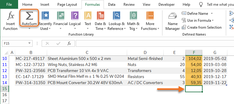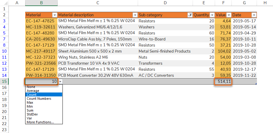 - Sum: Calculates the sum of the values in filtered rows.