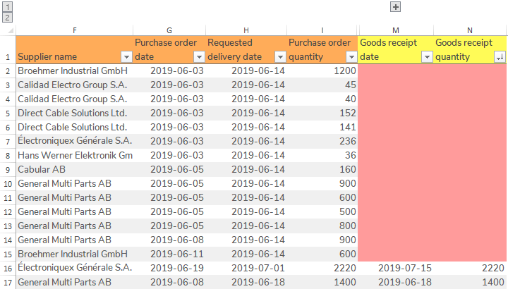 Create a lookup of columns Goods receipt date and Goods receipt quantity from Goods receipts sheet into Purchase orders sheet using the keys.
