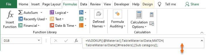 = VLOOKUP( [@Material]; TableMaterialData; MATCH( TableMaterialData[[#Headers]; [Sub category]]; TableMaterialData[#Headers]; 0 ); 0 )