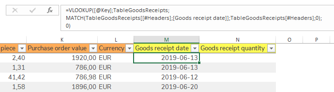 Returns the value from the defined column and from the same row as the first match between lookup value and the leftmost column.